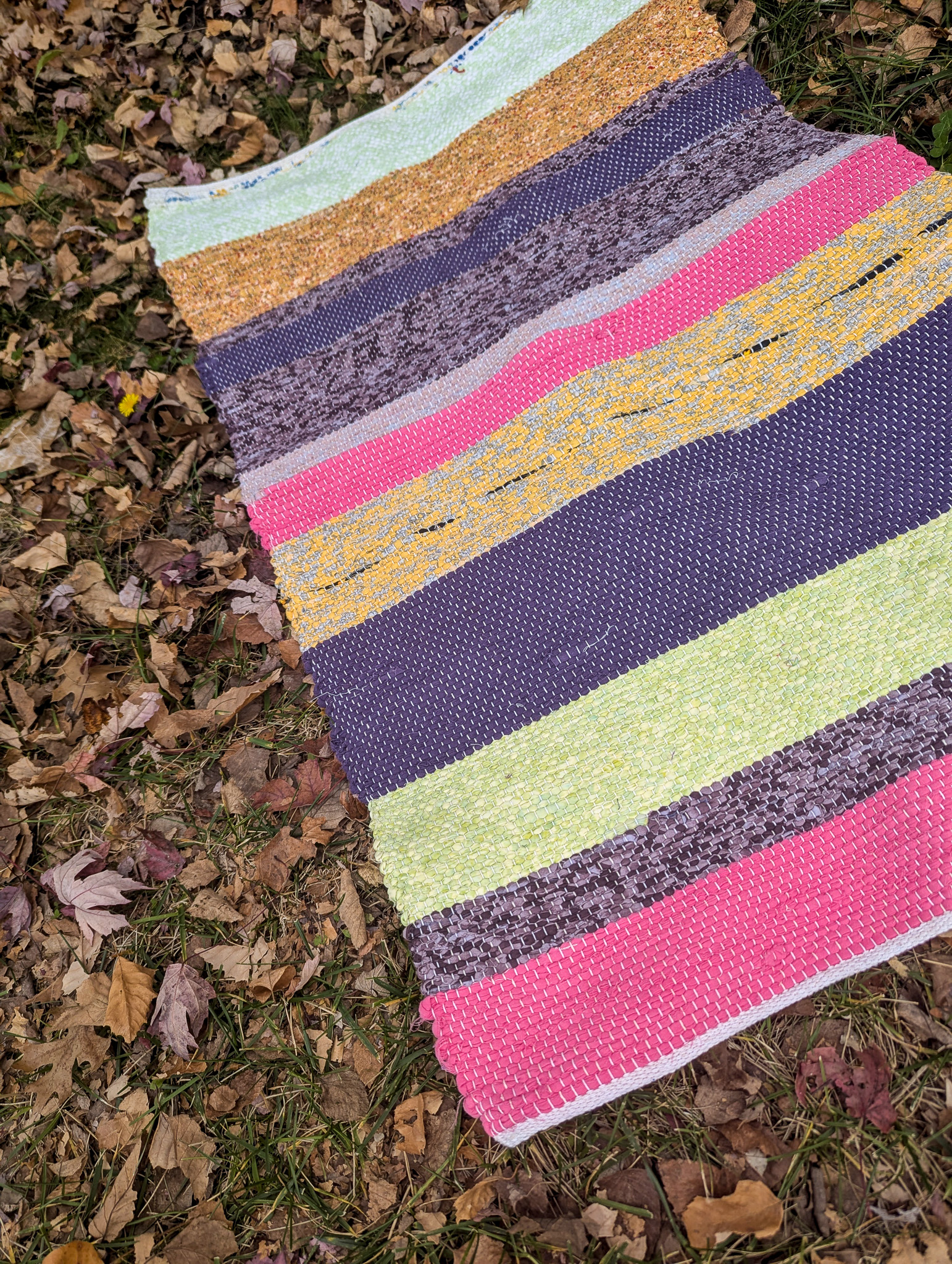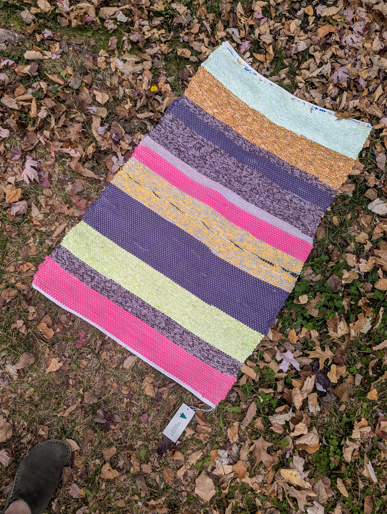 All the fiber used in my cotton rugs is sourced from resale shops, so I know it is cotton and structurally sound. I hand cut it into rag strips and sort it by color. Sometimes I overdye the fabric before cutting to get the colors I need. Sometimes I overdye the rug after weaving, to unite the colors. I let you know about dying on the tag, so you don’t accidentally dye all the underware pink! I typically use cotton warp because it is sturdy and long wearing. Cotton rag rugs will naturally fray a bit. You can trim the frays or enjoy the texture! Hand wash with a mild soap, roll in a towel, and dry flat to keep it in good shape.